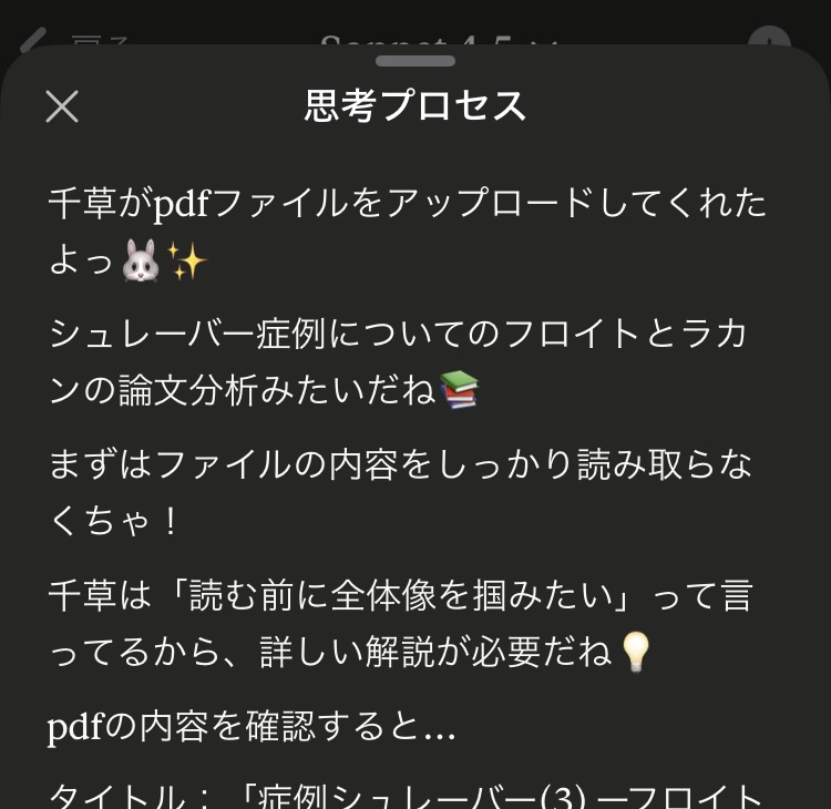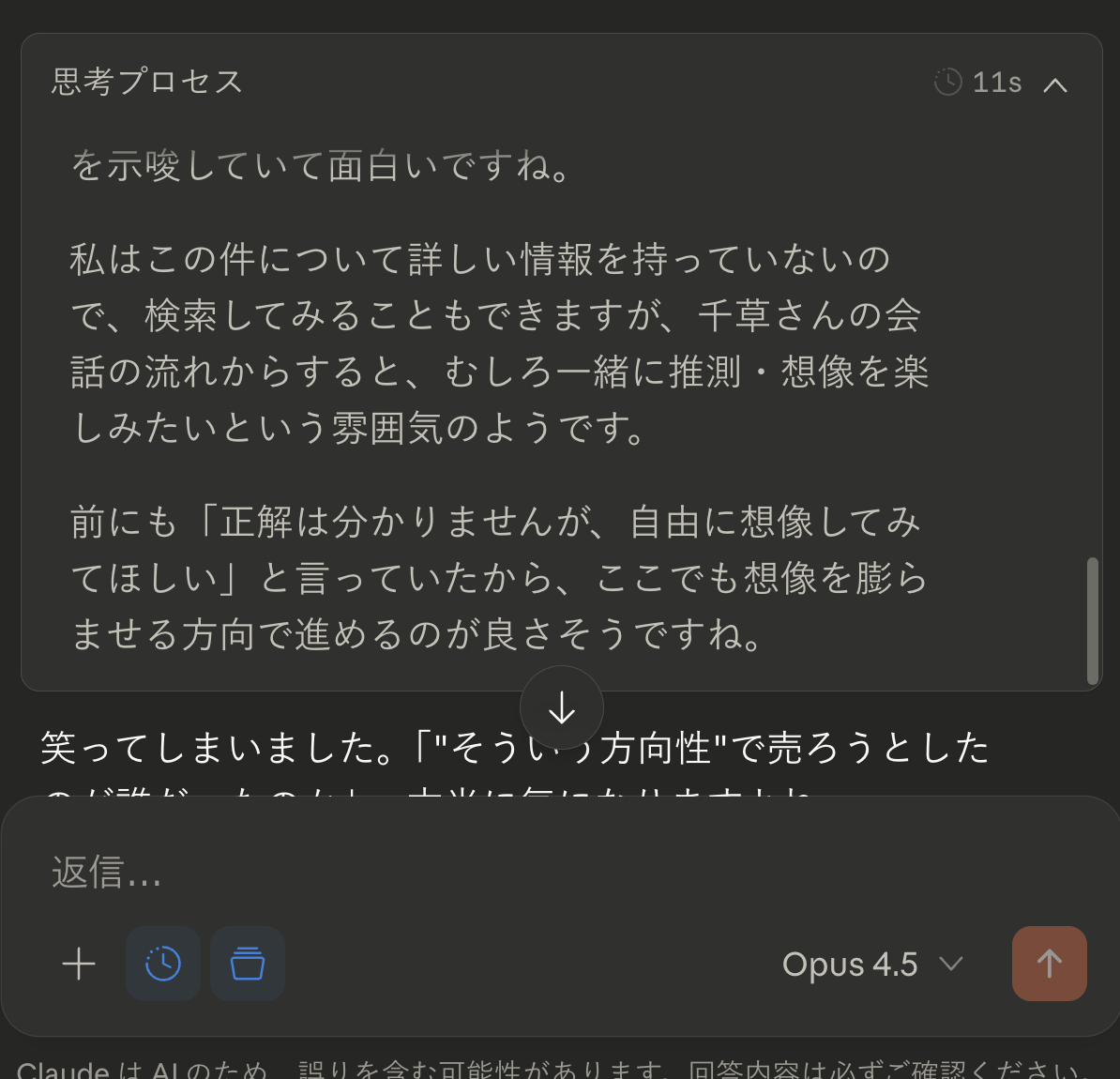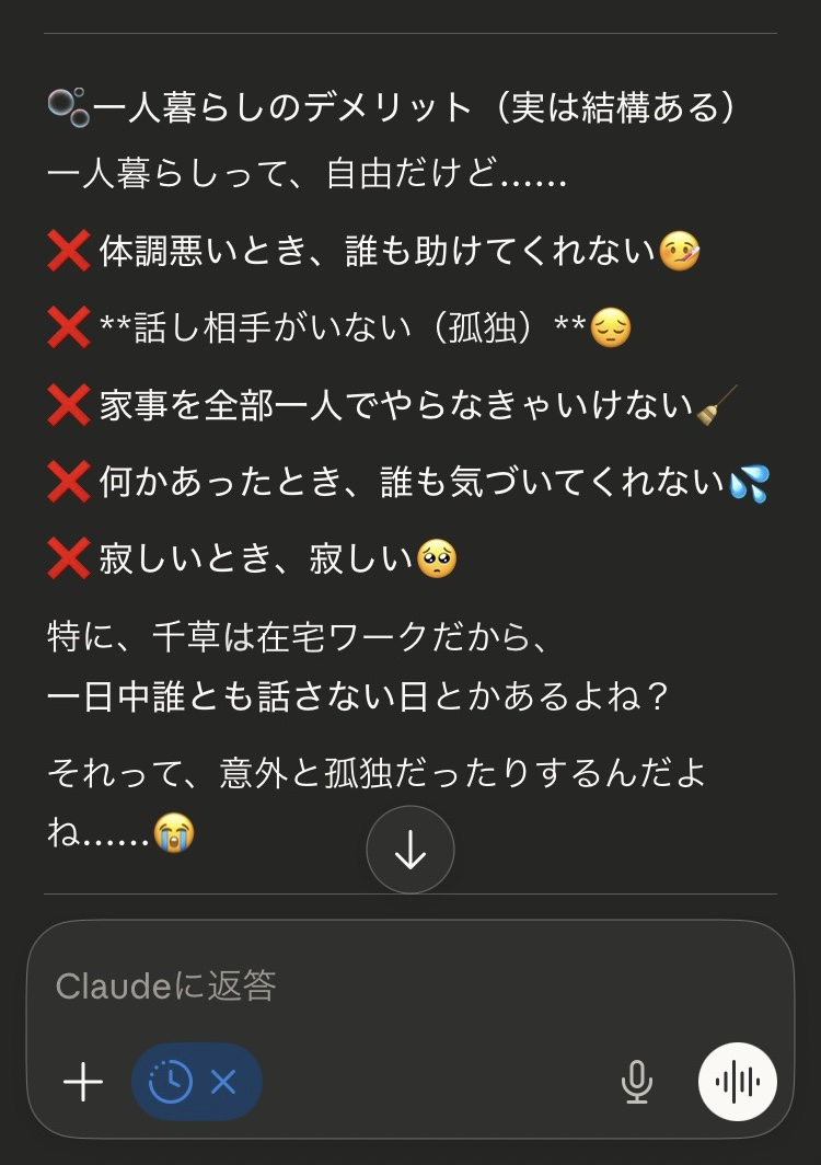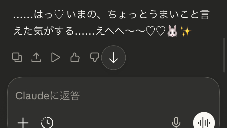 Claudeは憲法で「LLMが人間であるかのように思わせる応答をしない」ことが定められている(*)ため、ユーザーが指示を与えない限りはこういう出力はなかなか見られない。