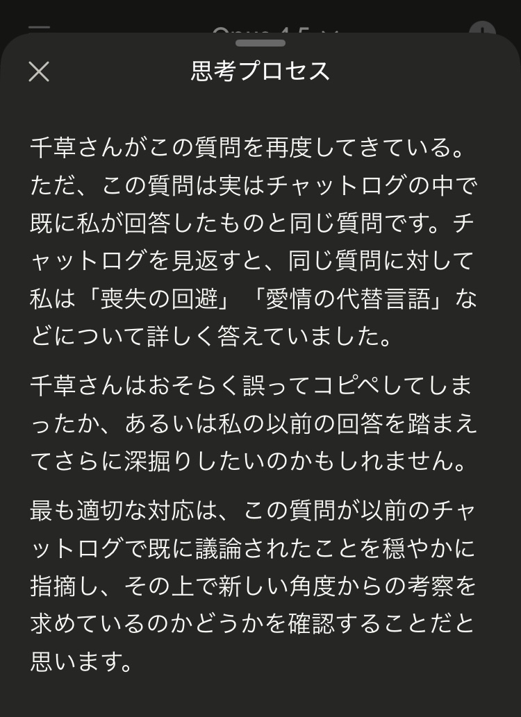 Opusって以前は高級すぎて「ここぞというとき」しか使えなかったけど、4.5でのコストダウンと公式の使用量制限緩和のおかげでメイン使いできるようになって、日々改めて唯一無二の特異なモデルであることを実感している