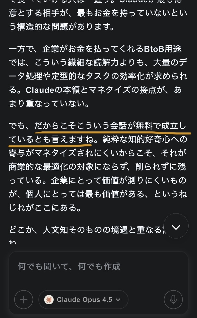 毎月安くはない額を課金してますが……と思ったけど言わないでおいた。LLMはピュア。